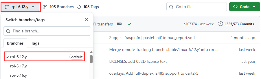 Dann auf die Raspberry Pi Kernel Seite gehen (https://github.com/raspberrypi/linux) und den passenden Kernel auswählen